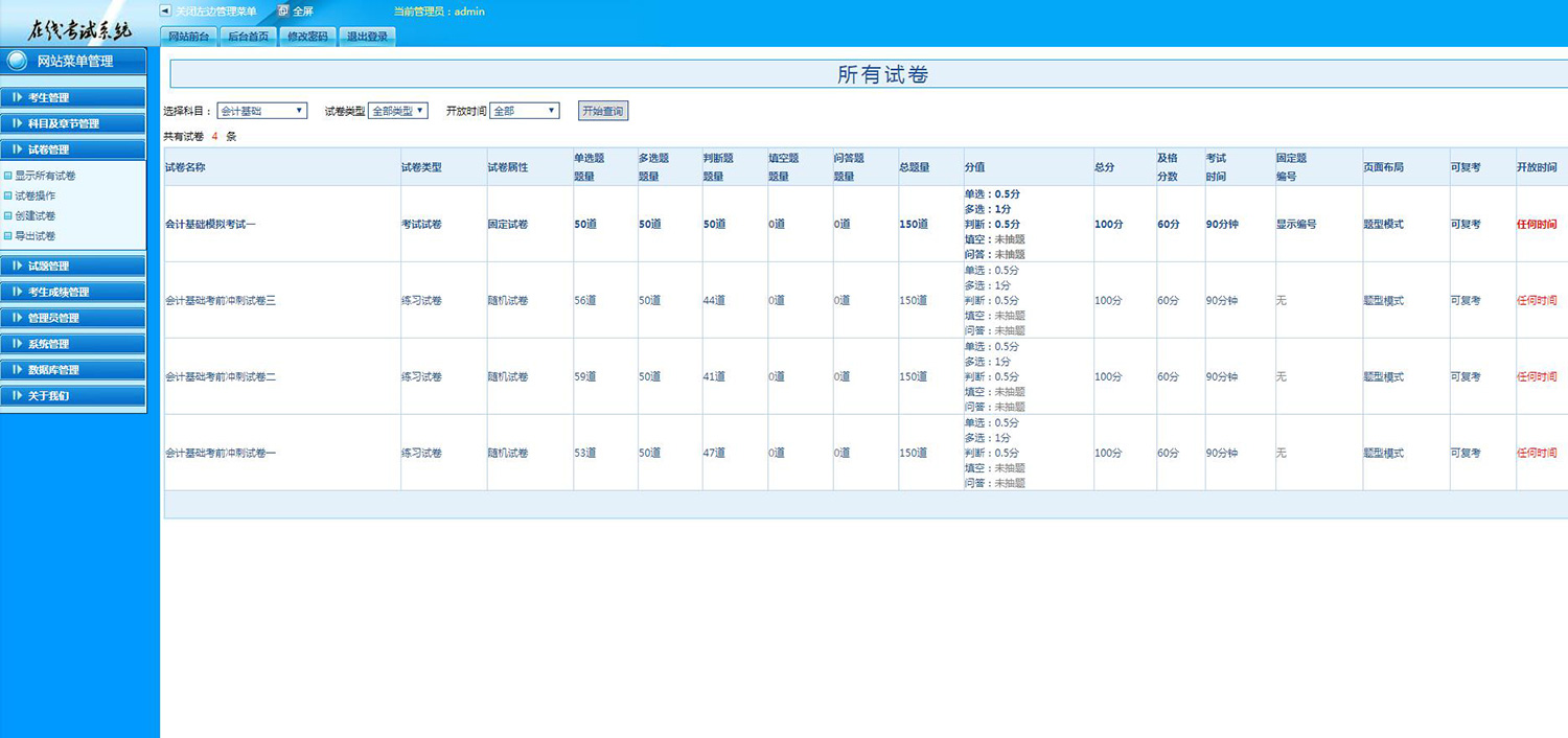 隨機組卷:此組卷方式在組卷時需要指定單選、多選及判斷時需要抽取的題數(shù),在考試時每個學生的試題內(nèi)容及順序不相同,但總題數(shù)是相同的,且都屬于同一科目。